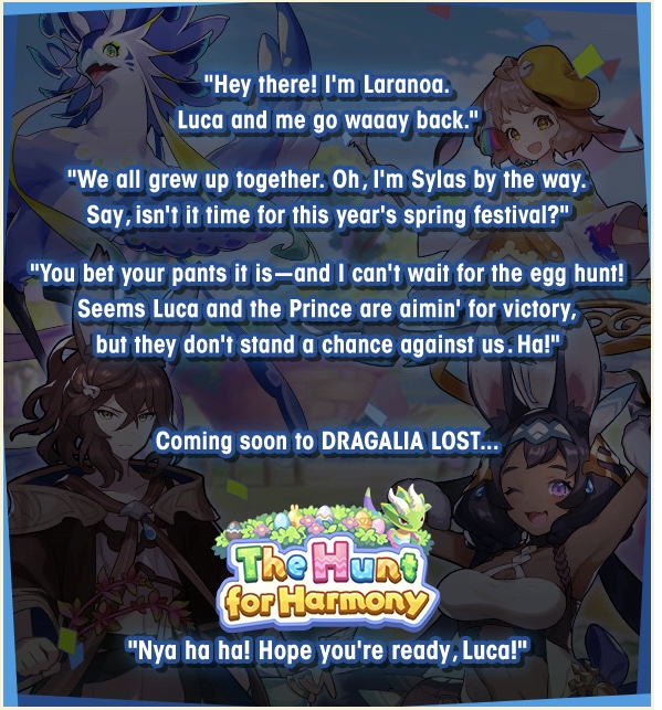 This event will pit your group of adventurers against bosses of the flame element. You’ll also be able to build an event-related reward facility for your Halidom!It’s time for the sylvans’ Vernal Banquet, where Rabbit-eared people from far and wide gather to celebrate. The main event is an egg hunt, and whoever collects the most eggs is granted one wish.