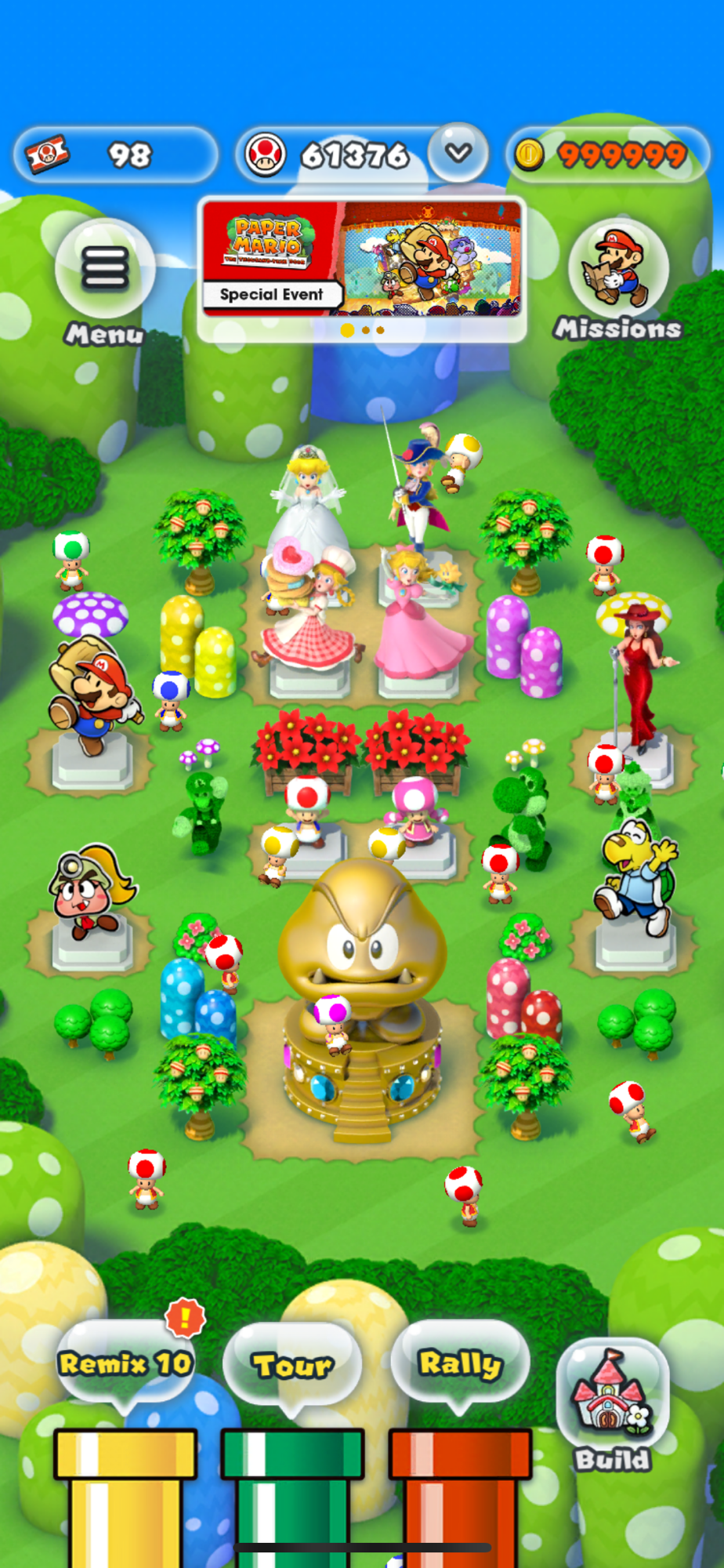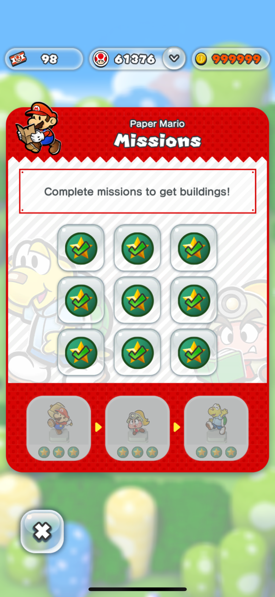You can check the mission objectives and how much progress you’ve made toward completing them by tapping the Missions icon in the top-right corner of the kingdom screen. If you get these Paper Mario™: The Thousand-Year Door statues, you can decorate your kingdom with them!